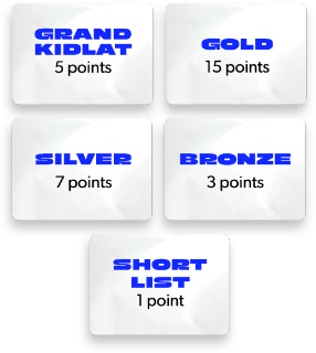 The winners of the Kidlat Agency of the Year, Kidlat Advertiser of the Year, Kidlat Audio Production House of the Year, Kidlat Audio Craft of the Year, Kidlat Film Production House of the Year, and Kidlat Film Craft of the Year will be determined by tallying the cumulative wins of the entrants after judging is done, based on the following point system: