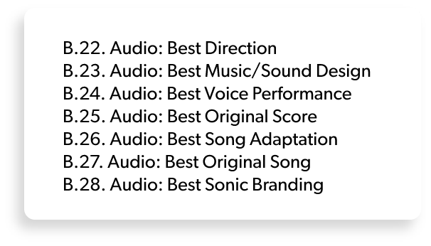 Awarded to the audio production house with the most number of points in the following Craft subcategories: